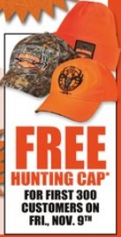 The first 300 customers at each Farm and Fleet store on 11/9 will receive a free hunting cap! They will be located in the sporting goods section.