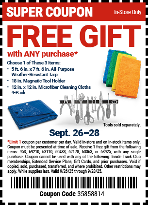 Harbor Freight just put out a new coupon that will be good through 12/26. This is a 10% off any single item coupon with NO exceptions. If you are an Inside Track Club member you save 20%. If you have a big ticket item to purchase the math may work out that you are better off signing up for ITC to save the additional 10%. Joining ITC currently costs $30 for the year so your break even point would be a $300 purchase. Make sure if you sign up today that your new account will receive the current 20% off promotion.