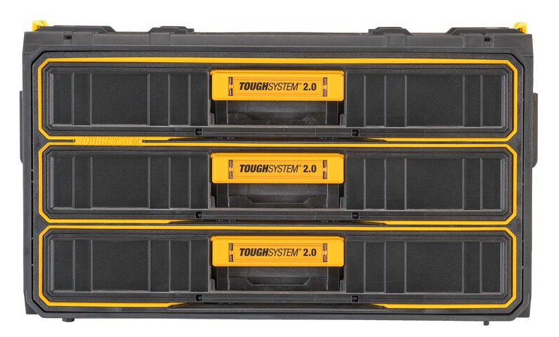 The DEWALT ToughSystem 3-Drawer Unit is also a customizable storage solution. The patented auto-connect side latches allow you to connect the unit to other ToughSystem units, providing even more storage space. And if you need to use the unit on its own, the one-touch release capability quickly disconnects it from other units. Additionally, this toolbox is compatible with all ToughSystem shelves and trolleys, making it a versatile storage solution for any workspace.