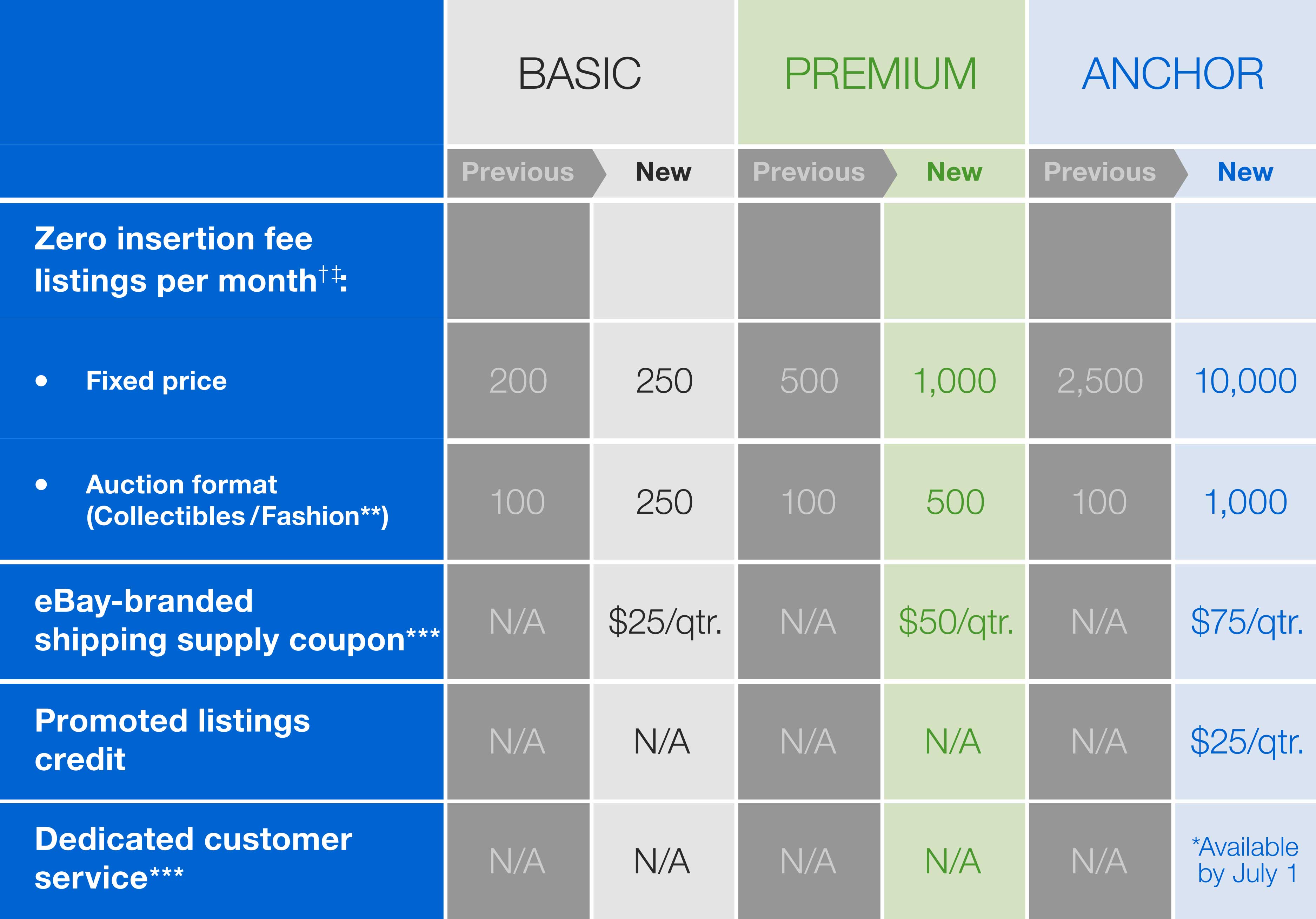 First let’s talk about the fee increases for store subscribers. eBay has not raised the store subscription prices over the last few years. (I actually think these might be the first price increases since the store concept was first launched.) The increase for basic store owners is $3 per month. $7.50 per month for premium stores. And $90 per month for anchor stores. The increases for the basic and premium stores is pretty modest but so are the benefits to those store owners. The premium stores are having a pretty hefty price increase but eBay is also giving them a dedicated customer service line, $75 per quarter in shipping supply coupons, eBay coaching and “Proactive policy consultation”, whatever that is.