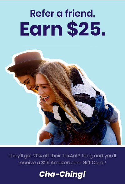 This year when I finished TaxAct brought me to a page with a referral link. As you can see from the graphic, if you sign up with TaxAct through THIS LINK they will give you 20% off your filing fee and they will give me a $25 Amazon gift card. Win-win situation right?