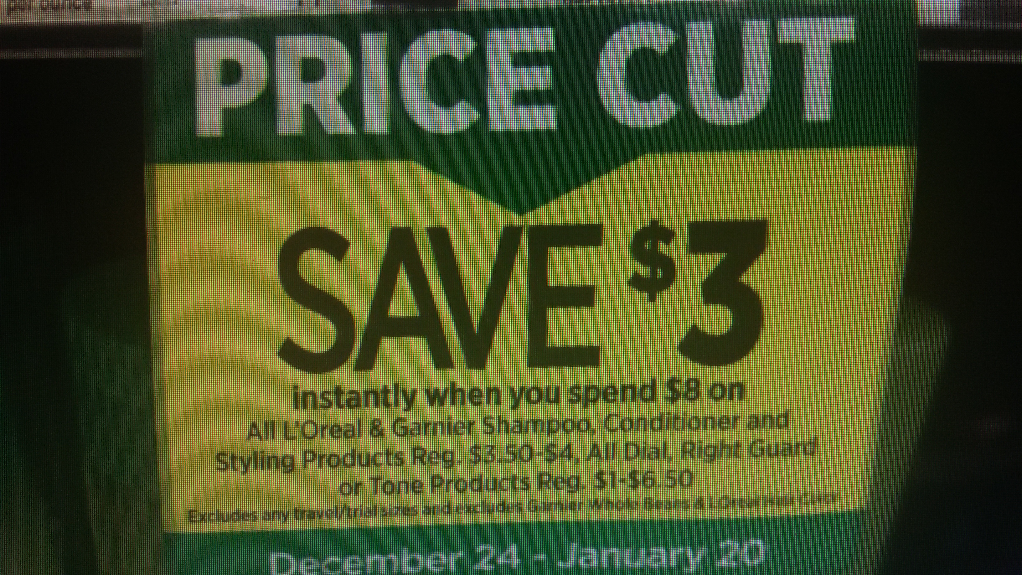 2 L’Oreal Shampoo and Condition are on sale $4.00 each and until January 20th spend $8 (which is two) Save $3 instantly at register. $4.00 X 2 = $8.00 – $3.00 = $5.00