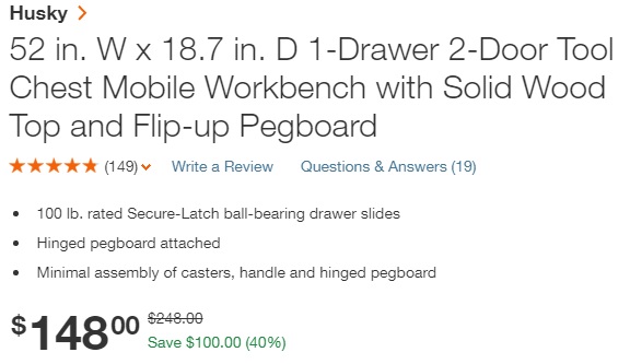 **This workbench is very similar to the Harbor Freight Yukon workbench. However the Yukon is 6 inches shorter. Also the Husky includes the optional flip up peg board and a power strip in the side of the bench. The Yukon is currently selling for $239.99 with THIS COUPON.