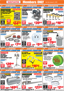 Below are scans for the January 2020 Harbor Freight Inside Track club coupons. Officially, you need to be an Inside Track Club member to use the coupons below. Membership also comes with early access to Parking Lot sales and weekly Inside Track Club coupon e-mails.