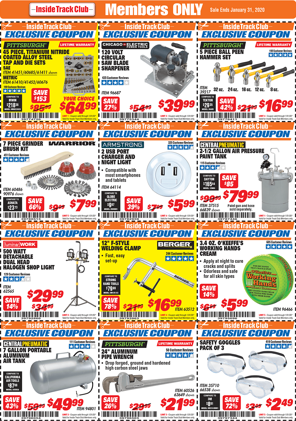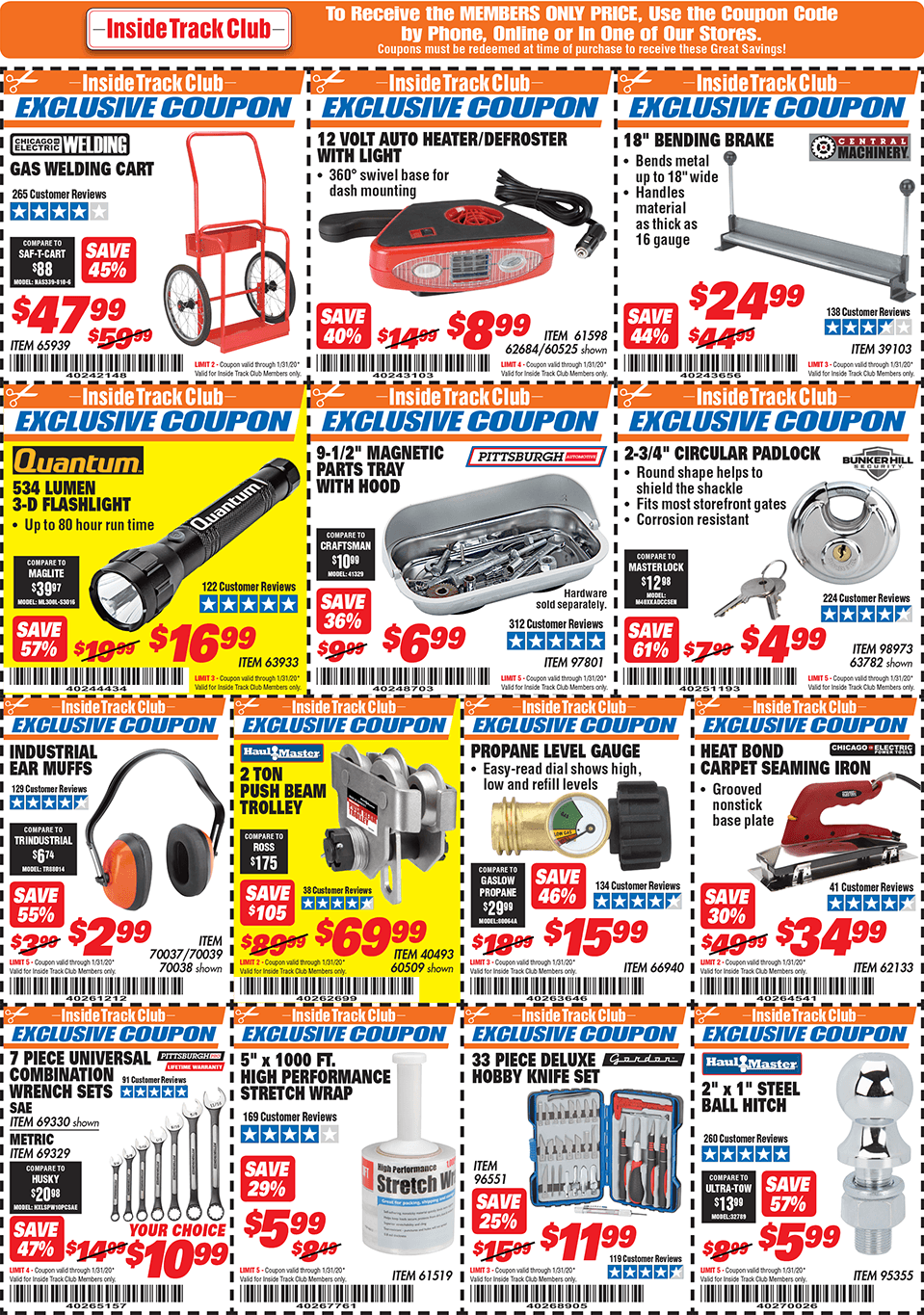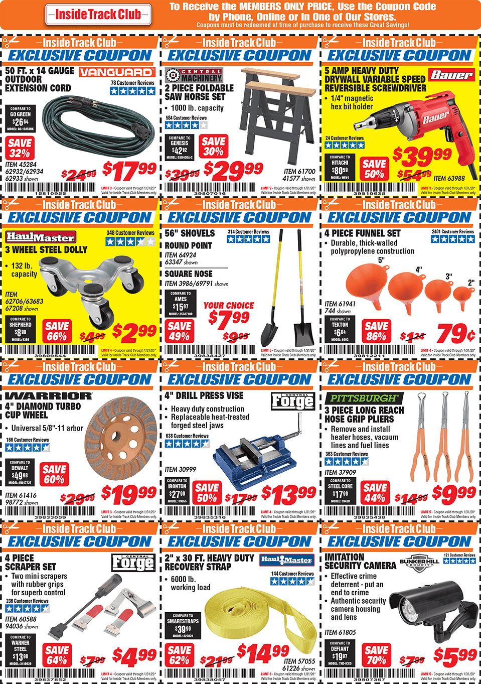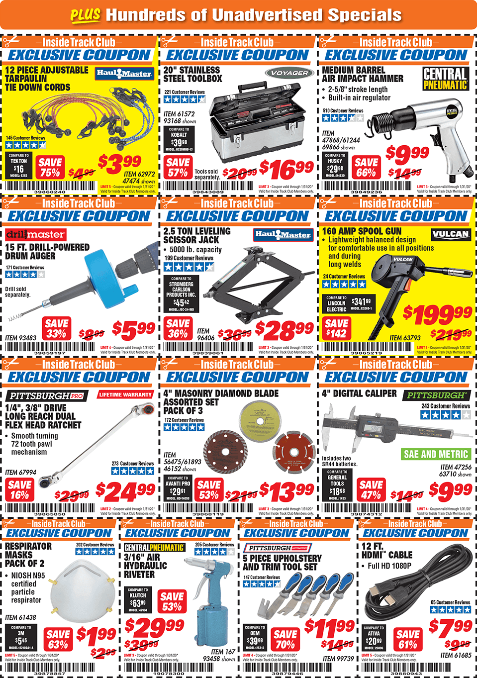 Below are scans for the January 2020 Harbor Freight Inside Track club coupons. Officially, you need to be an Inside Track Club member to use the coupons below. Membership also comes with early access to Parking Lot sales and weekly Inside Track Club coupon e-mails.