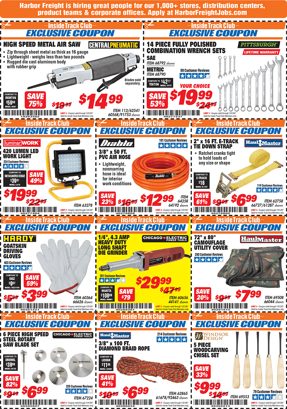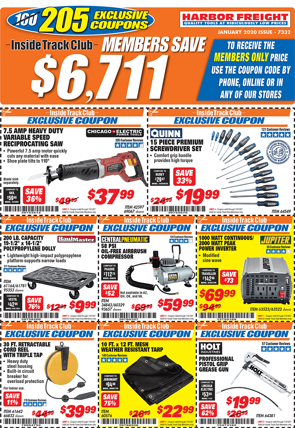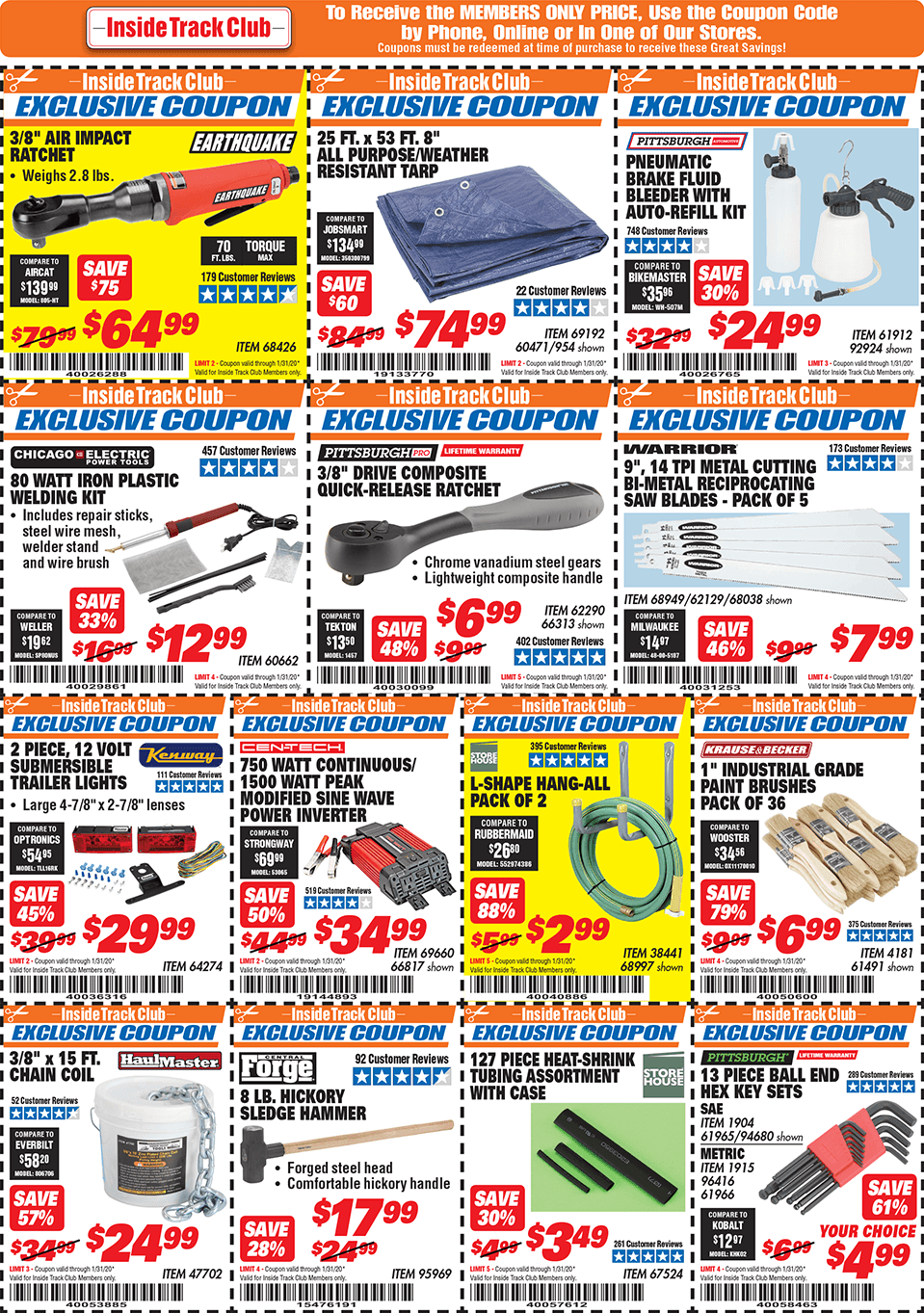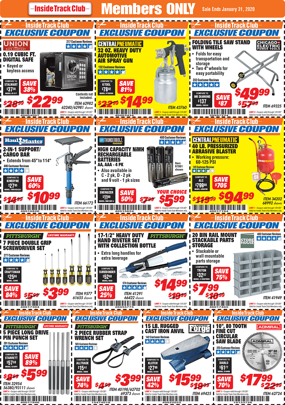 Below are scans for the January 2020 Harbor Freight Inside Track club coupons. Officially, you need to be an Inside Track Club member to use the coupons below. Membership also comes with early access to Parking Lot sales and weekly Inside Track Club coupon e-mails.