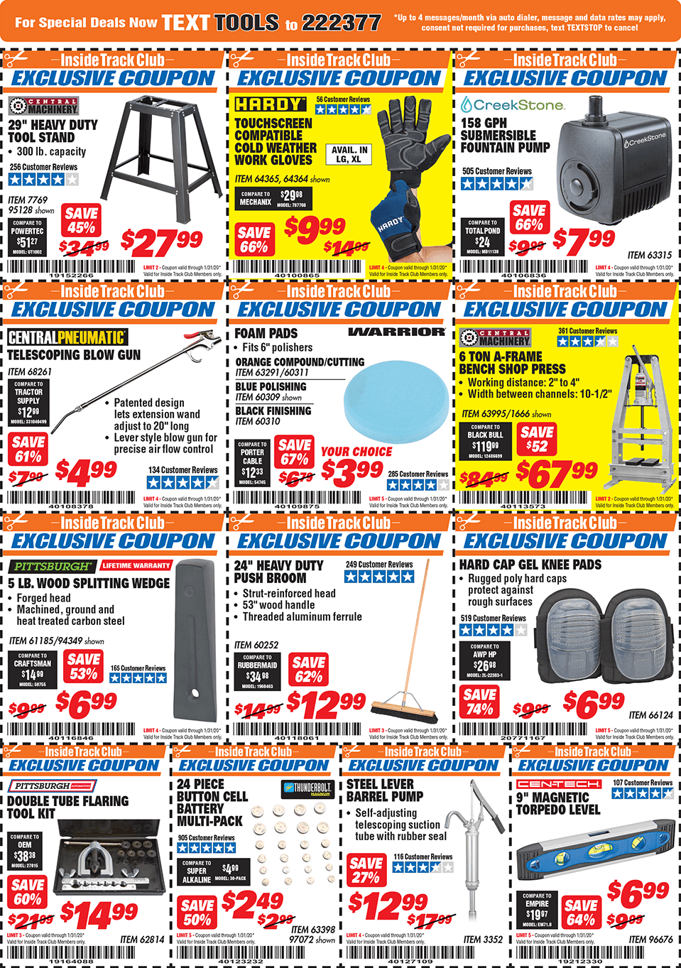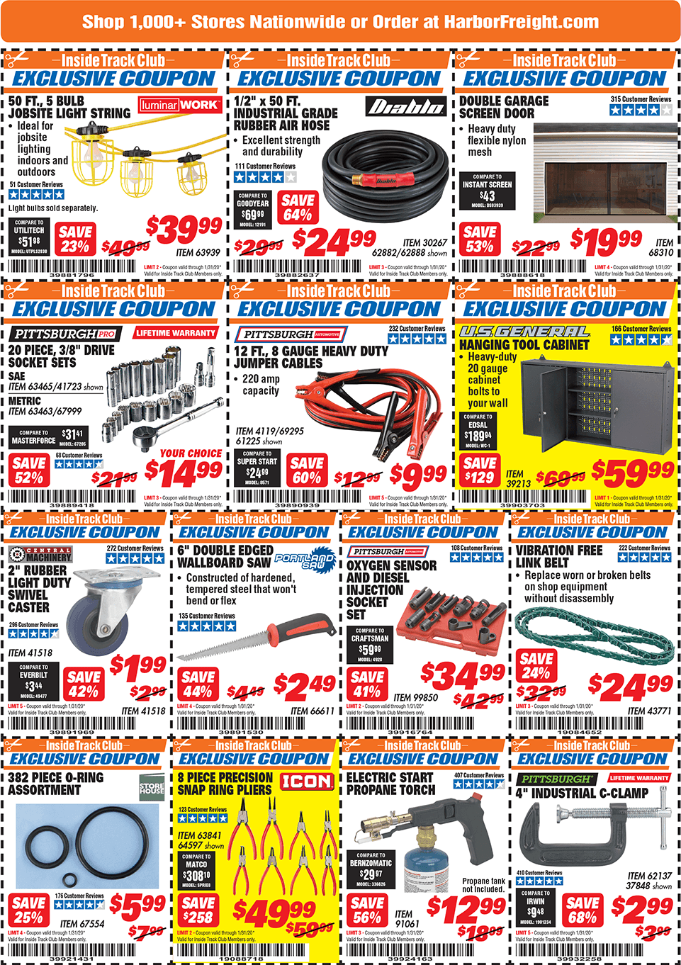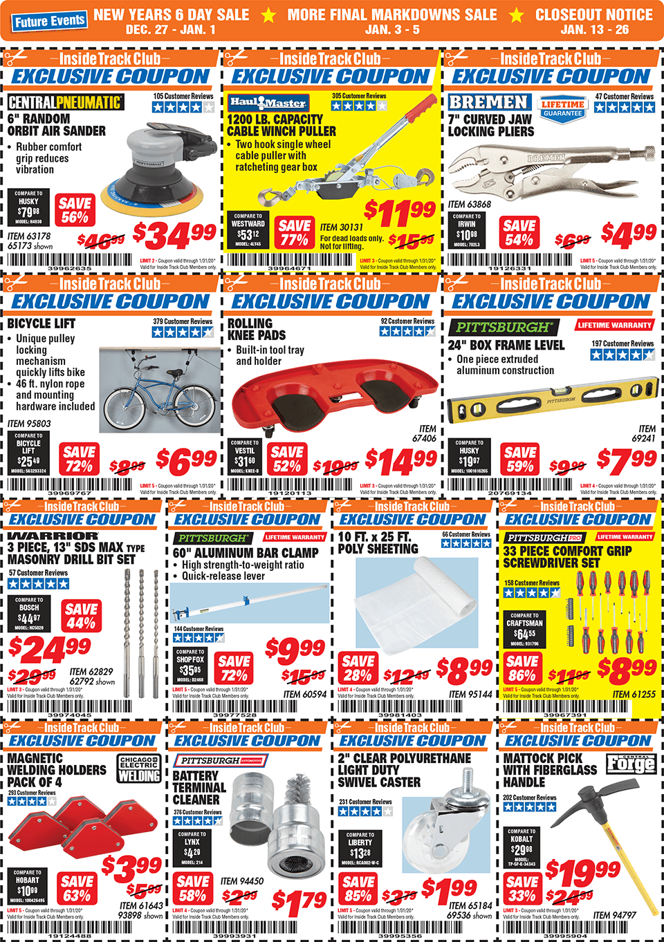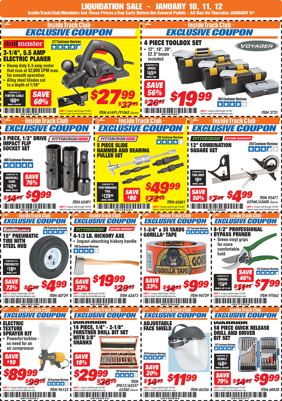 Below are scans for the January 2020 Harbor Freight Inside Track club coupons. Officially, you need to be an Inside Track Club member to use the coupons below. Membership also comes with early access to Parking Lot sales and weekly Inside Track Club coupon e-mails.