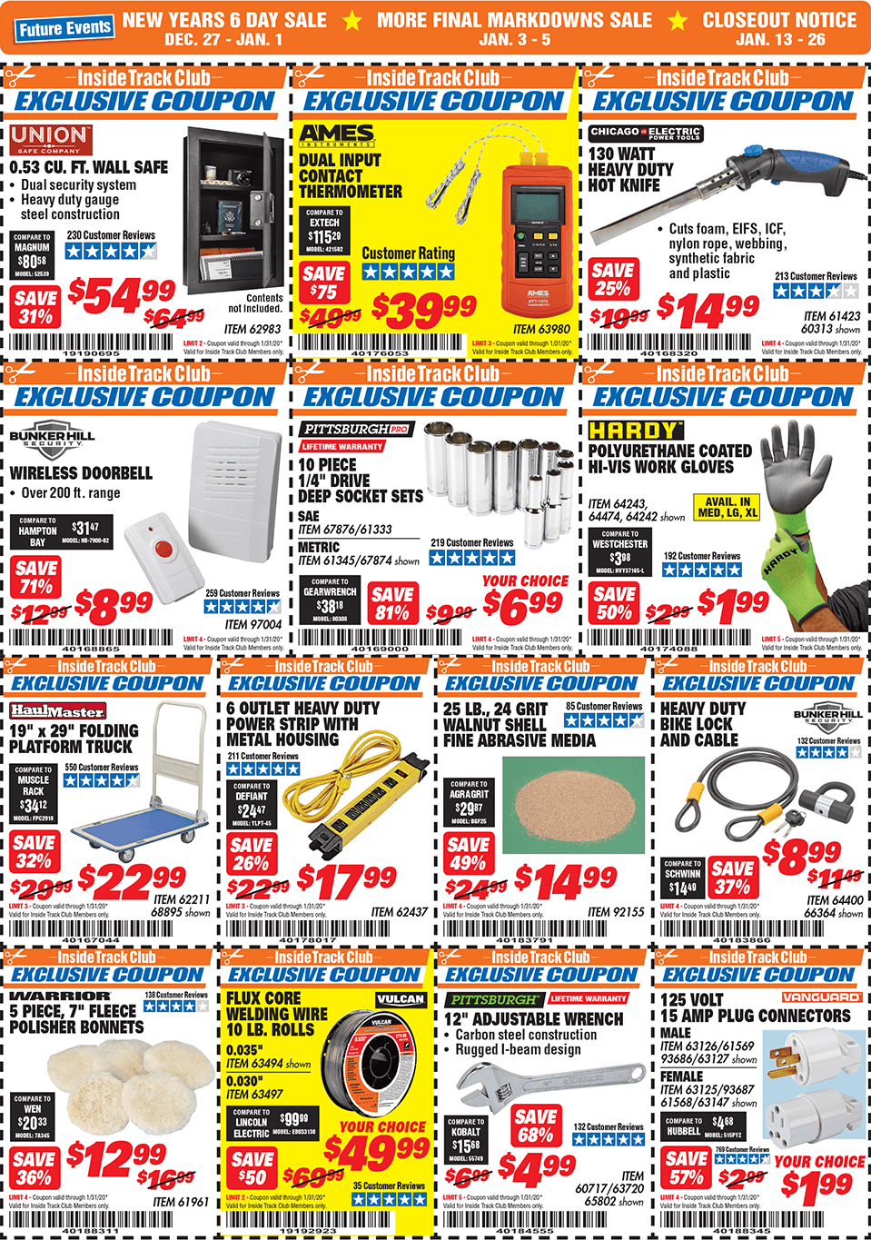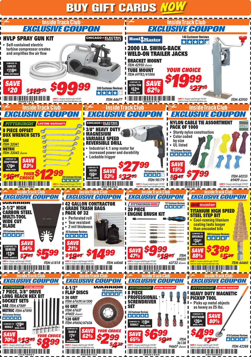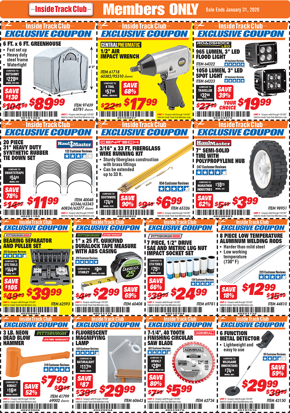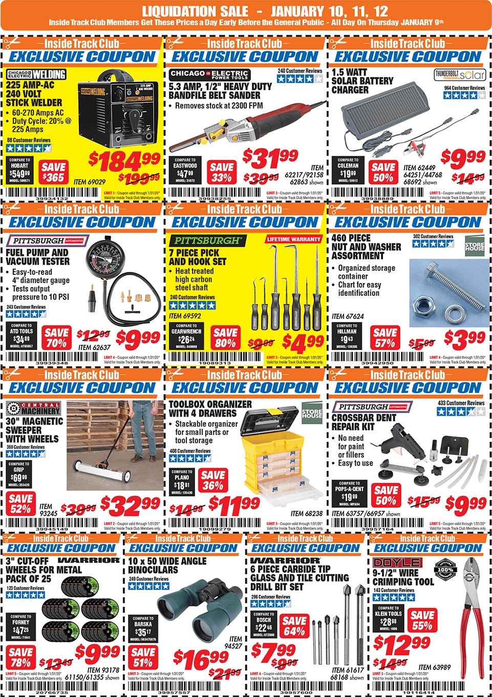 Below are scans for the January 2020 Harbor Freight Inside Track club coupons. Officially, you need to be an Inside Track Club member to use the coupons below. Membership also comes with early access to Parking Lot sales and weekly Inside Track Club coupon e-mails.