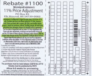 If you are a Menards shopper then you probably have already heard of their 11% off sales. During these sales you will receive a Menards rebate worth 11% of your total purchase. What you might not know is that their is also an 11% Price Adjustment rebate. With this rebate you can get 11% off on purchases you made up to 2 weeks before the 11% sale started. Menards does not put this rebate on their website or make it available with the other rebates in the store. The only way to get this rebate is to ask for it at the customer service desk. Or print our copy below.