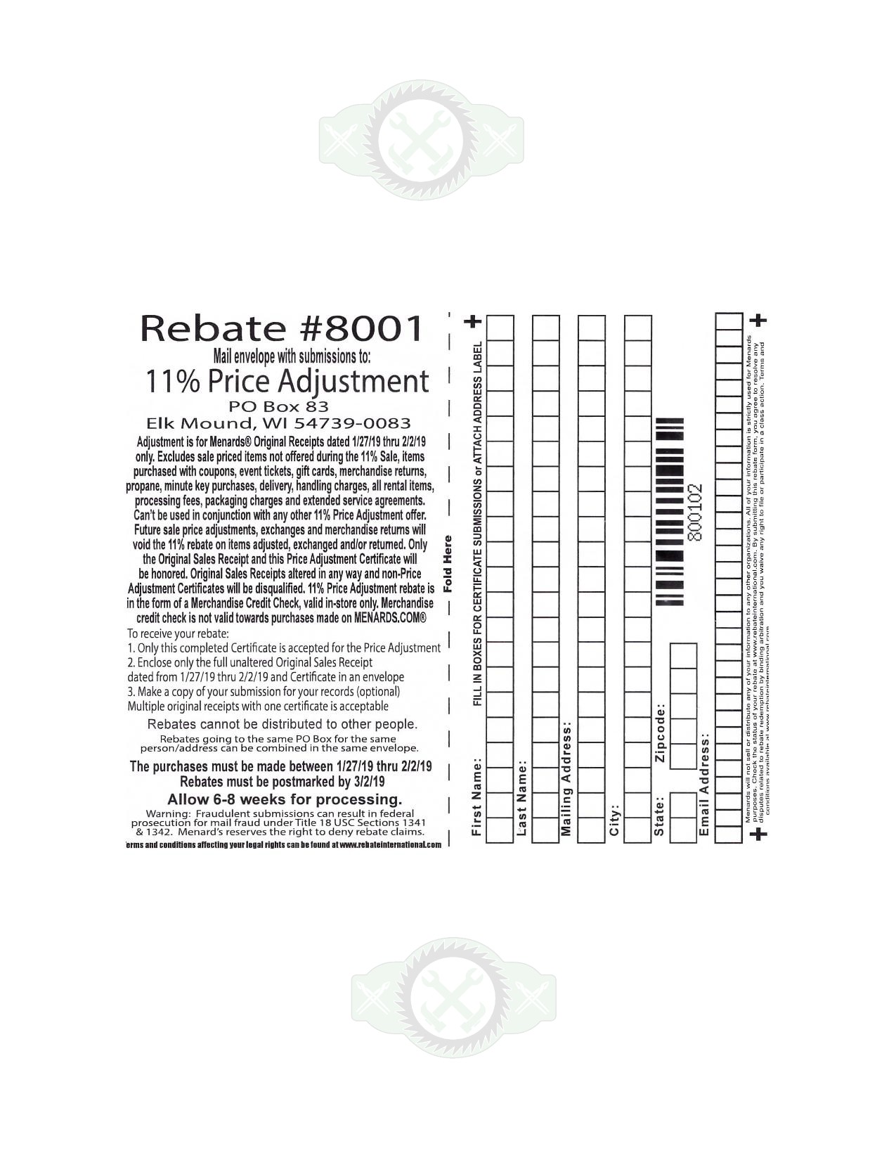 Menards 11% Price Adjustment Rebate #8001 – Purchases 1/27/19-2/2/19