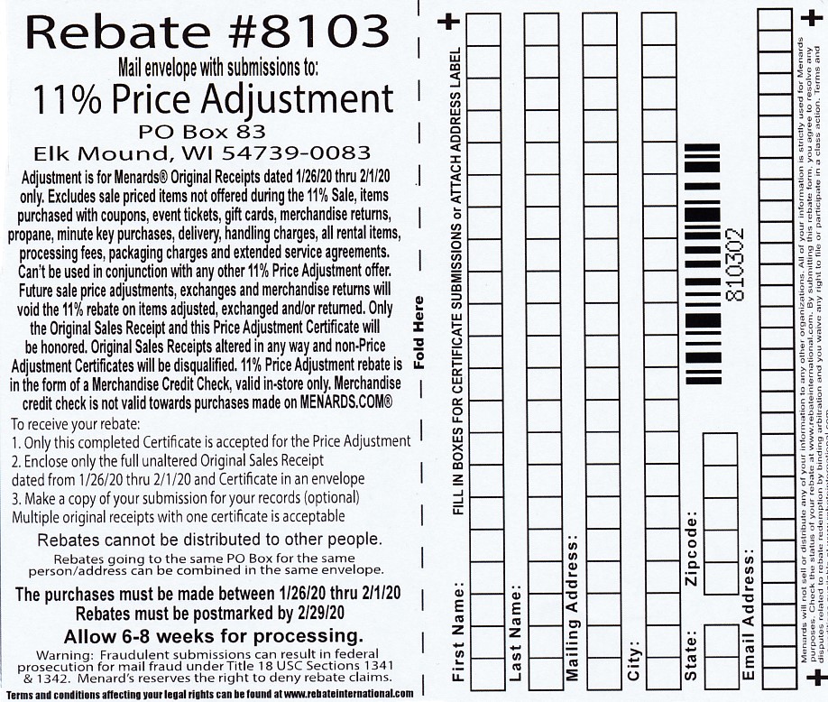 If you are a Menards shopper then you probably have already heard of their 11% off sales. During these sales you will receive a Menards rebate worth 11% of your total purchase. What you might not know is that their is also an 11% Price Adjustment rebate. With this rebate you can get 11% off on purchases you made up to 2 weeks before the 11% sale started. Menards does not put this rebate on their website or make it available with the other rebates in the store. The only way to get this rebate is to ask for it at the customer service desk. Or print our copy below.