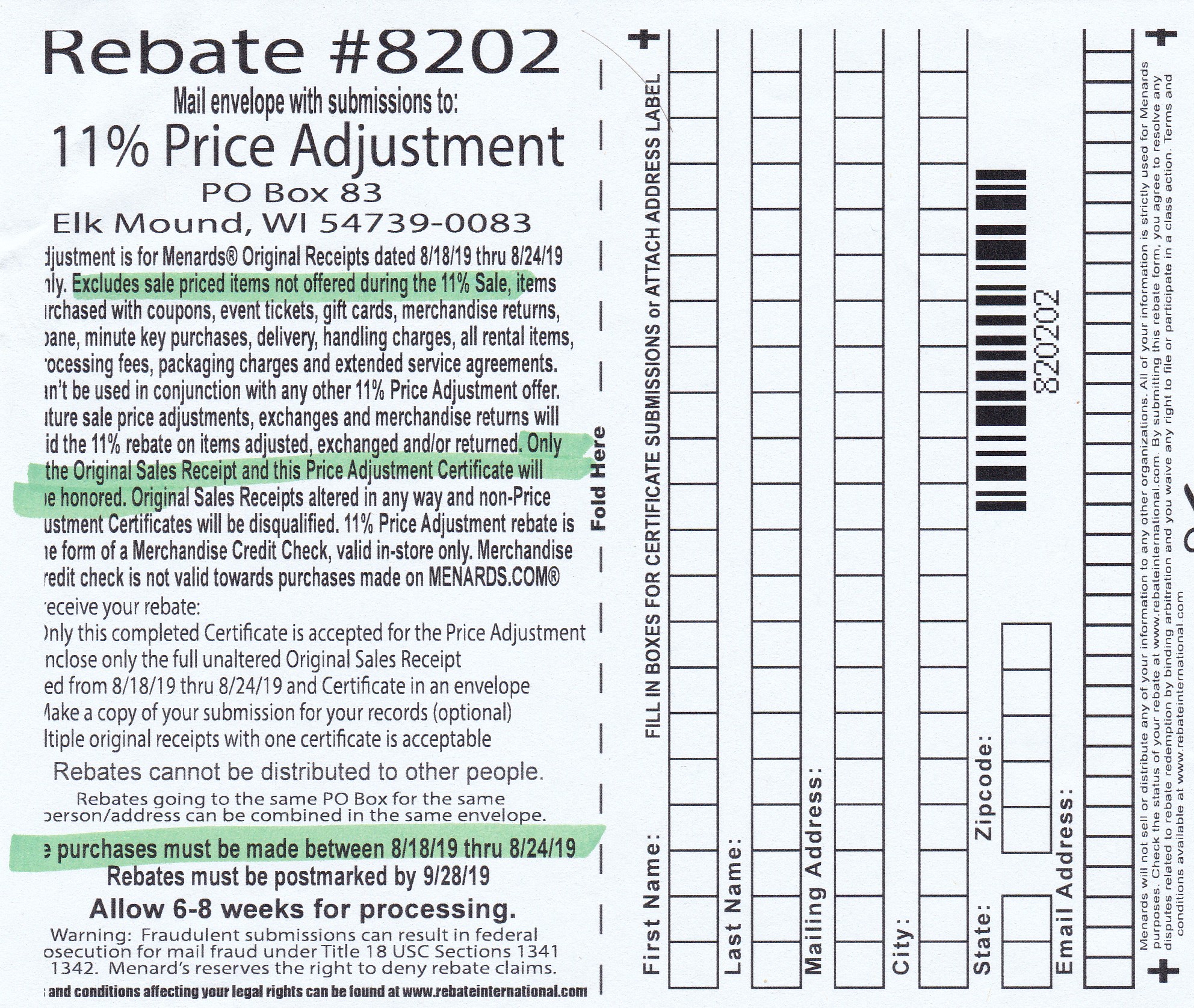 If you are a Menards shopper then you probably have already heard of their 11% off sales. During these sales you will receive a Menards rebate worth 11% of your total purchase. What you might not know is that their is also an 11% Price Adjustment rebate. With this rebate you can get 11% off on purchases you made up to 2 weeks before the 11% sale started. Menards does not put this rebate on their website or make it available with the other rebates in the store. The only way to get this rebate is to ask for it at the customer service desk. Or print our copy below.