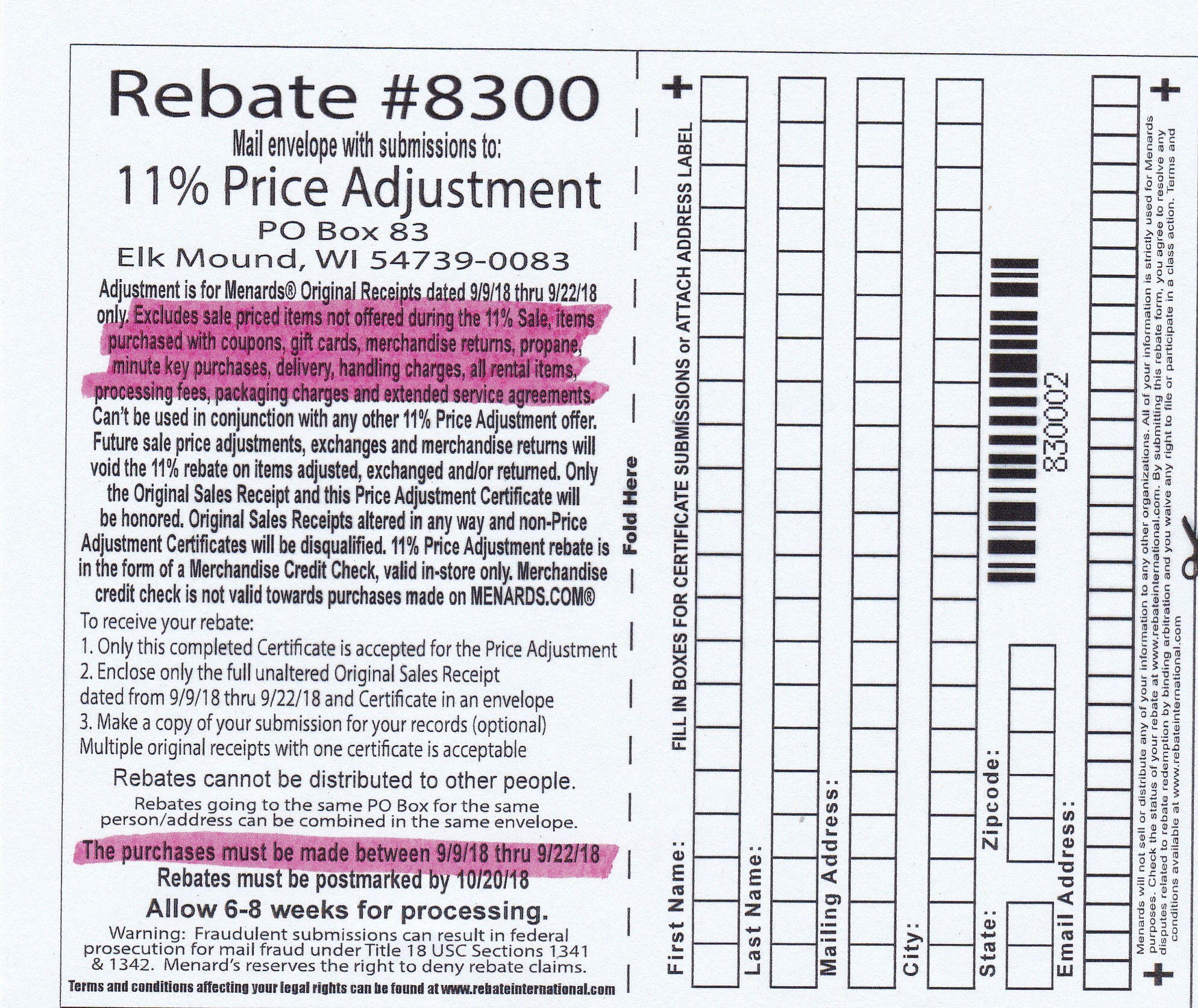 If you are a Menards shopper then you probably have already heard of their 11% off sales. During these sales you will receive a Menards rebate worth 11% of your total purchase. What you might not know is that their is also an 11% Price Adjustment rebate. With this rebate you can get 11% off on purchases you made up to 2 weeks before the 11% sale started. Menards does not put this rebate on their website or make it available with the other rebates in the store. The only way to get this rebate is to ask for it at the customer service desk. Or print our copy below.