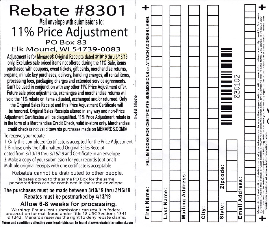 If you are a Menards shopper then you probably have already heard of their 11% off sales. During these sales you will receive a Menards rebate worth 11% of your total purchase. What you might not know is that their is also an 11% Price Adjustment rebate. With this rebate you can get 11% off on purchases you made up to 2 weeks before the 11% sale started. Menards does not put this rebate on their website or make it available with the other rebates in the store. The only way to get this rebate is to ask for it at the customer service desk. Or print our copy below.