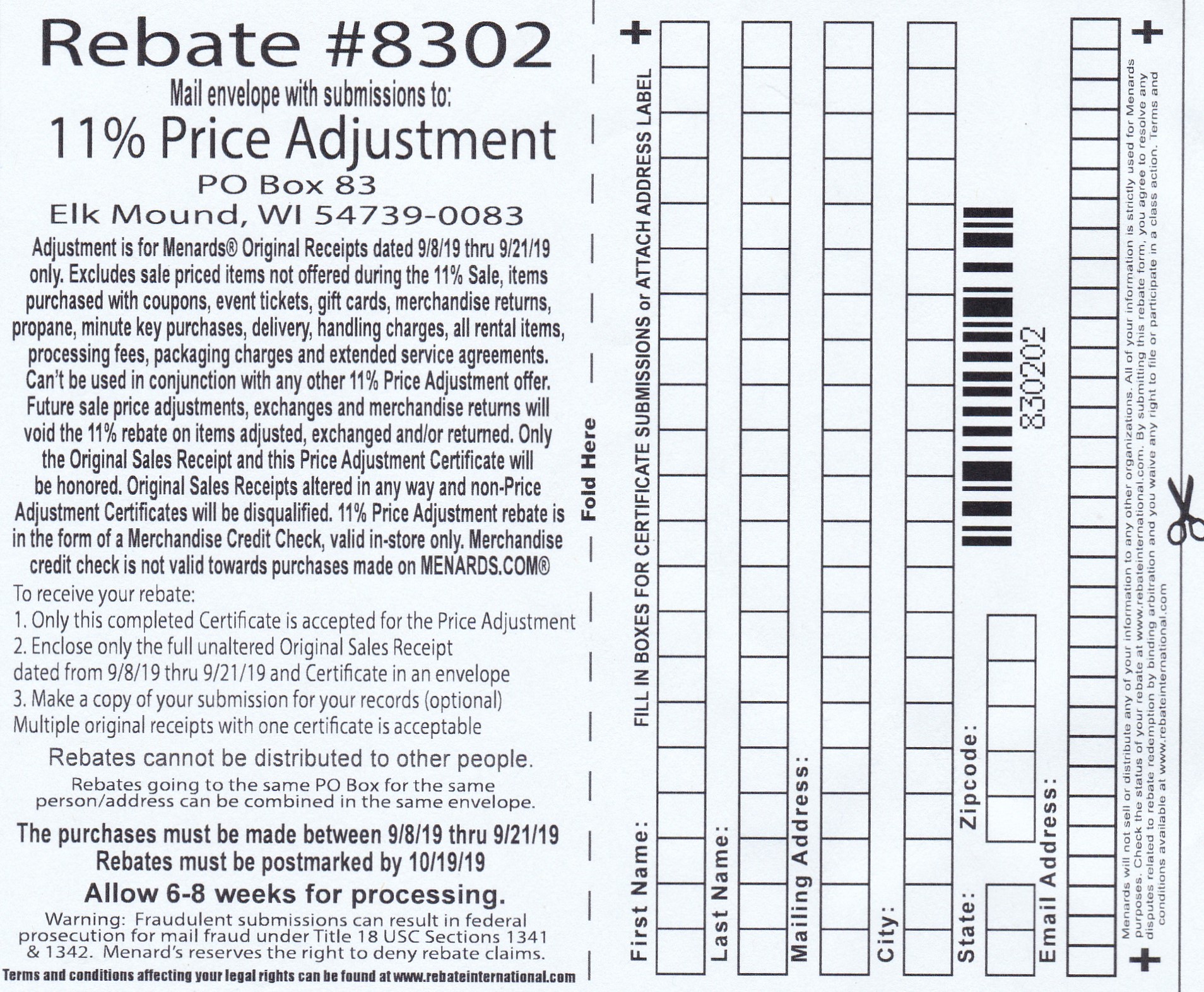 Menards 11 Percent Price Adjustment Rebate Number 8302