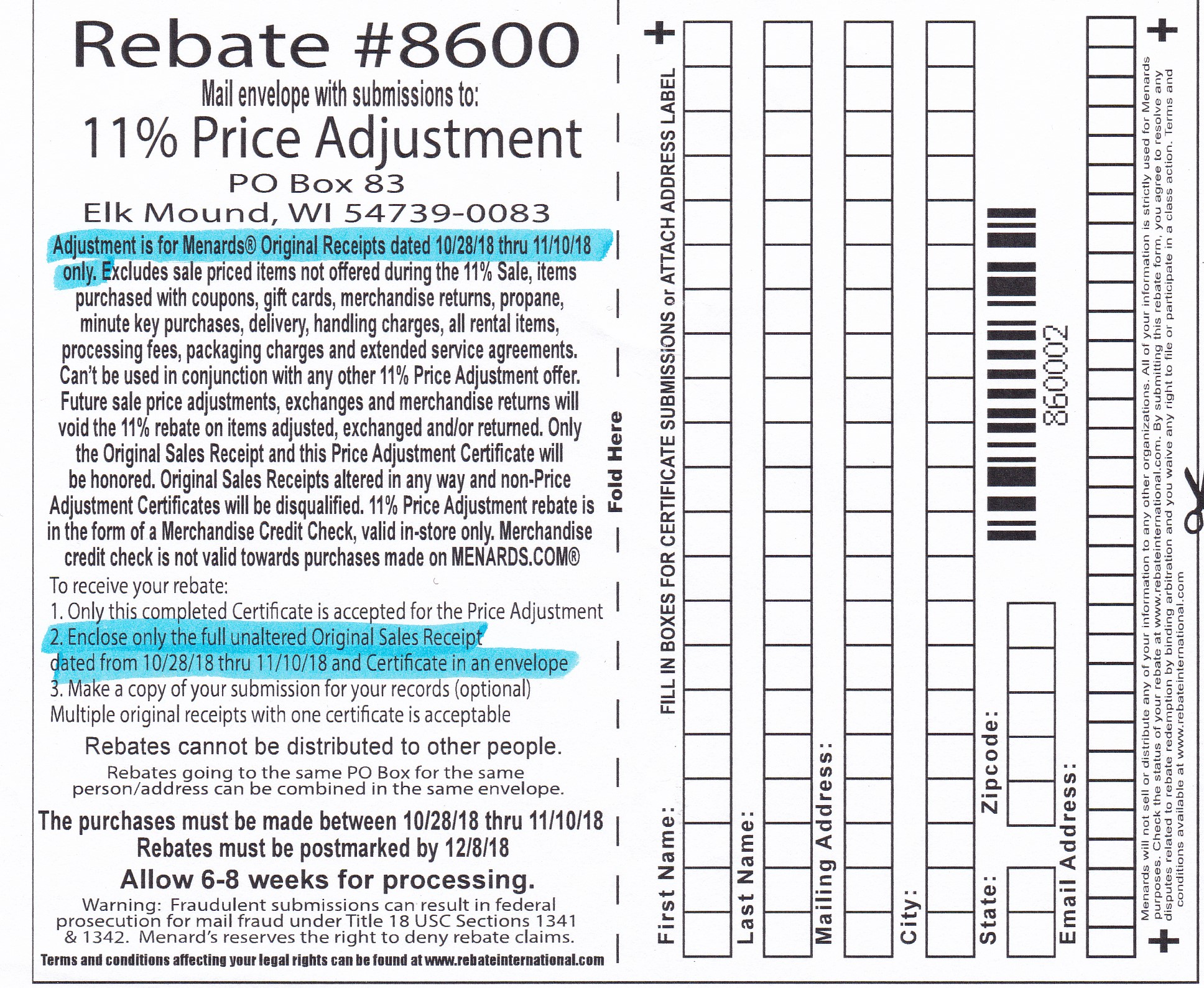 If you are a Menards shopper then you probably have already heard of their 11% off sales. During these sales you will receive a Menards rebate worth 11% of your total purchase. What you might not know is that their is also an 11% Price Adjustment rebate. With this rebate you can get 11% off on purchases you made up to 2 weeks before the 11% sale started. Menards does not put this rebate on their website or make it available with the other rebates in the store. The only way to get this rebate is to ask for it at the customer service desk. Or print our copy below.