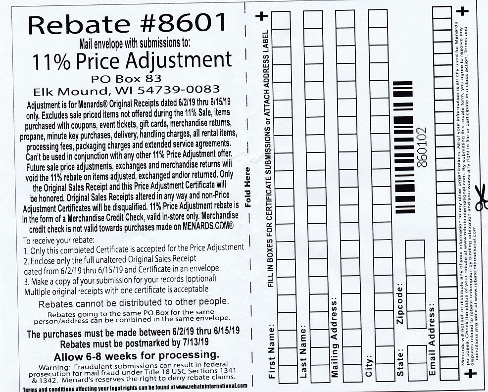 If you are a Menards shopper then you probably have already heard of their 11% off sales. During these sales you will receive a Menards rebate worth 11% of your total purchase. What you might not know is that their is also an 11% Price Adjustment rebate. With this rebate you can get 11% off on purchases you made up to 2 weeks before the 11% sale started. Menards does not put this rebate on their website or make it available with the other rebates in the store. The only way to get this rebate is to ask for it at the customer service desk. Or print our copy below.
