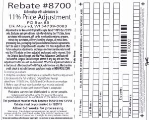 If you are a Menards shopper then you probably have already heard of their 11% off sales. During these sales you will receive a Menards rebate worth 11% of your total purchase. What you might not know is that their is also an 11% Price Adjustment rebate. With this rebate you can get 11% off on purchases you made up to 2 weeks before the 11% sale started. Menards does not put this rebate on their website or make it available with the other rebates in the store. The only way to get this rebate is to ask for it at the customer service desk. Or print our copy below.
