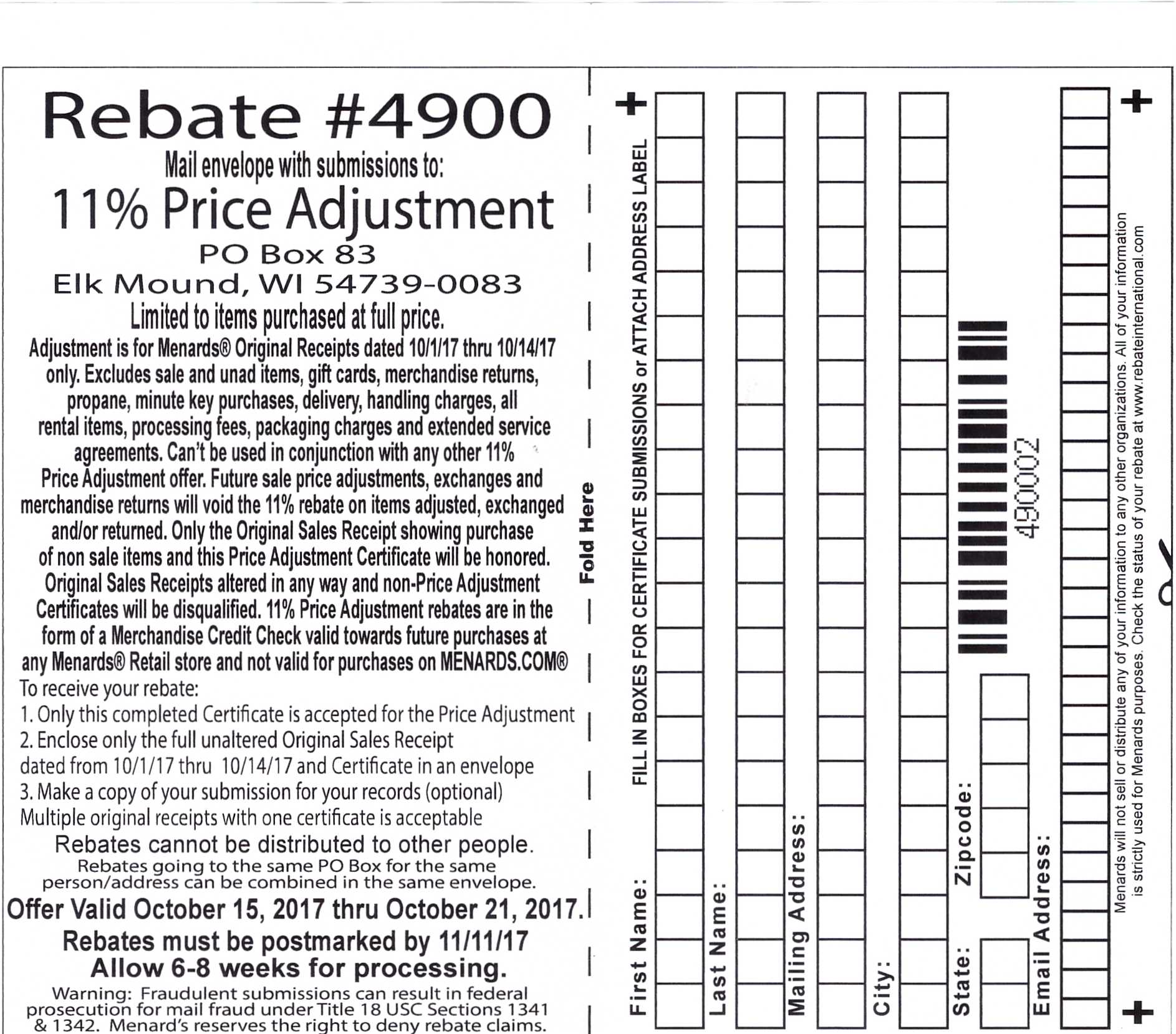 If you are a Menards shopper then you probably have already heard of their 11% off sales. During these sales you will receive a Menards rebate worth 11% of your total purchase. What you might not know is that their is also an 11% Price Adjustment rebate. With this rebate you can get 11% off on purchases you made up to 2 weeks before the 11% sale started. Menards does not put this rebate on their website or make it available with the other rebates in the store. The only way to get this rebate is to ask for it at the customer service desk. Or print our copy below.