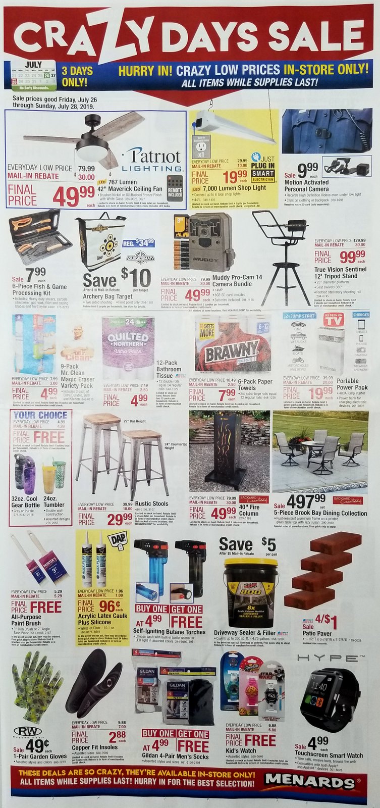 This weekend Menards is having another one of their CRAZY DAYS sales! The sale starts on Friday July 26th and goes through Sunday July 28th. Many of the best deals during CRAZY DAYS sales will sell out so be sure to get to Menards ASAP! Below are scans of all 4 pages of the CRAZY DAYS sale ad and a list of the best deals!