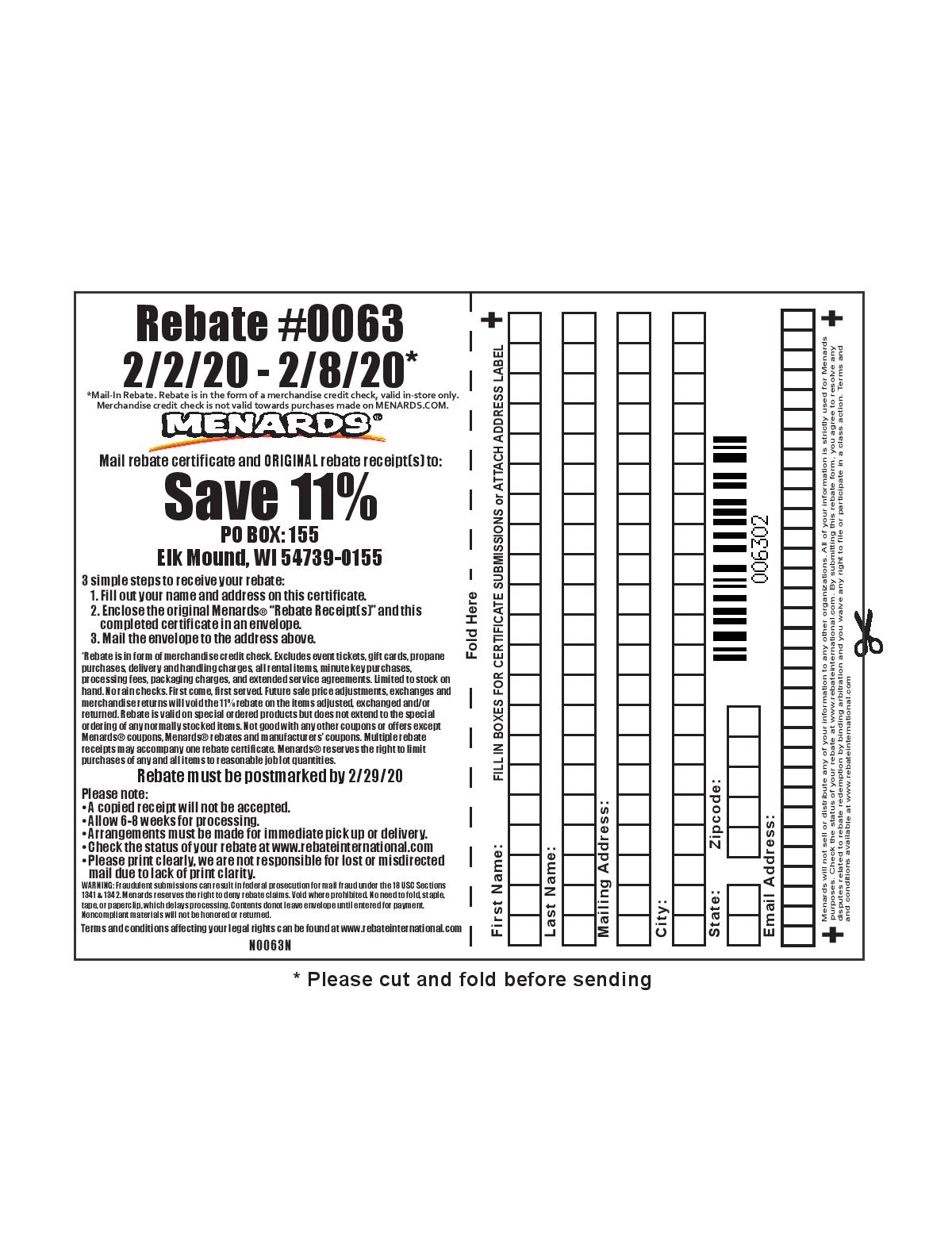 Menards 11% Rebate #0063 – Purchases 2/2/20 – 2/8/20