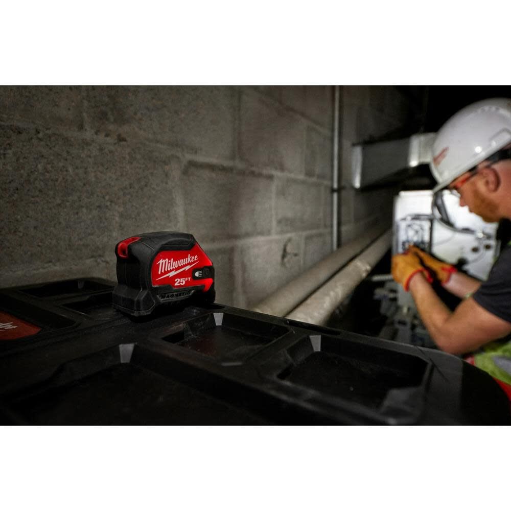 The MILWAUKEE® 25ft Compact Wide Blade Magnetic Tape Measure is also built to last. The impact-resistant lens and frame, as well as the IP54-rated lens, ensure that this tape measure can withstand harsh job site conditions. The wear-resistant nylon blade protection and anti-tear coating on the first 6 inches of the blade reduce tape tear, making it easier to take accurate measurements.