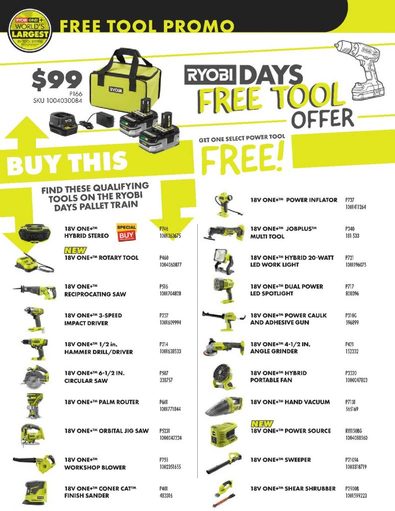 For this Home Depot promotion you are going to buy a Ryobi starter kit which includes 2 3ah batteries, charger and bag and you will get to choose a free bare tool. They have a ton of different bare tool options, when you click the picture above or the Buy Now link below it will take you to the starter kit and their is a box on the Home Depot page that allows you to see all of your bare tool options.